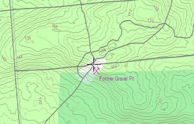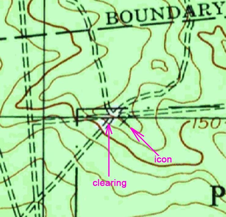 It is also shown on the USGS 24k topo, but that area is so cluttered that it isn't obvious. Look closely and you will see the "crossed shovels" icon and also a small blue-tinted area that denotes the clearing. The grid line and the road are right on top of it, so it's very hard to see. That is why I make my maps at a scale of 1:3000 instead of 1:24000 like the USGS. That is 8x the scale, but 64 times more data (8 x 8). :)