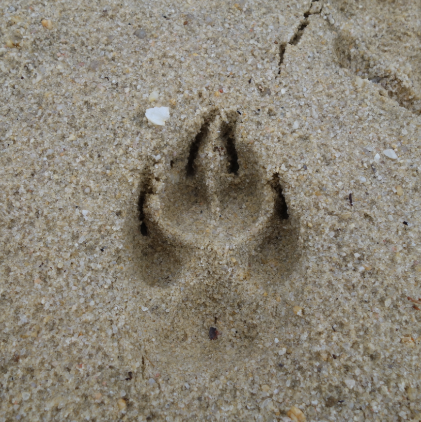 This one tricked me. A cursory look at the front paws side-by-side, plus the fact that the trail seemed to originate at the base of a tree, made me think that I was looking at Eastern gray squirrel prints. However, I realized later that the front prints were registering in front of the hind, making this a rabbit track. Interestingly, the bound was a bit shorter and in the opposite direction as the one pictured above, so I'm guessing that he ran into a fox and took off in another direction, and the tracks pictured above are of him running from the fox (there were also fox tracks near the rabbit tracks, see below).