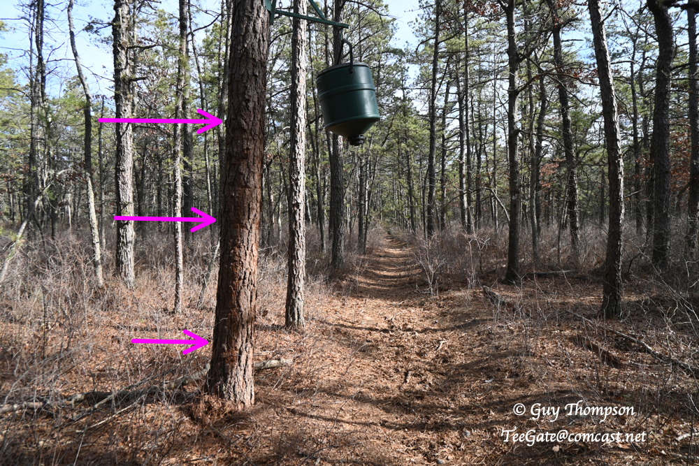 Was stone searching today in Greenwood and this was right in one of the firebreaks. Look closely at the tree with the arrows. I doubt that is from putting it up but maybe it is. I was thinking coyotes are trying to jump up to get the corn in the barrel???????