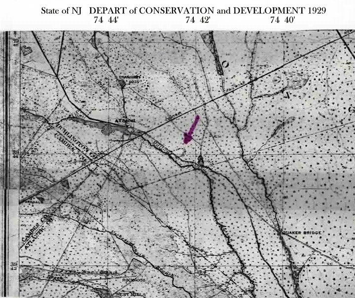 Don, you may me right. The farm shown in your map is just a tad to the North-west of the spot I pinpointed as the drained area. How big were the Fruitland farm lots? 20 acres? The drained area may still fall within the property boundary for that farm. The only thing is, according to several maps that feature the Fruitland lots, the lots didn't seem to extend beyond Quaker Bridge Road.Tracker-Jim, FWIW - This is an aerial photo from 1929, don't know if you have seen it? If this is the altered section along the river that you found, it looks a lot like a Fruitland farm to me, don't know this for sure.