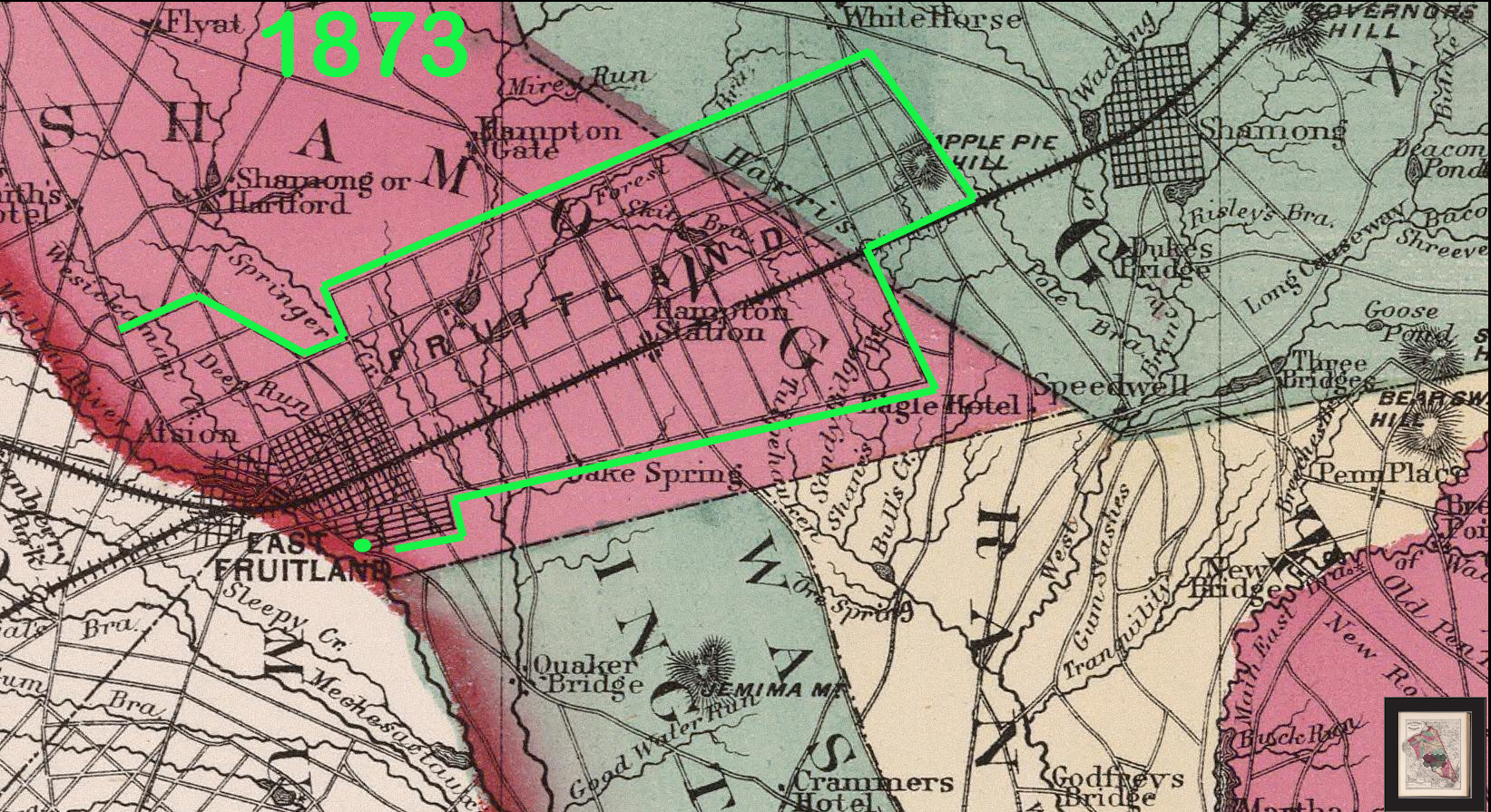 The following is a 1873 map that shows Fruitland extending all the way to Apple Pie Hill. It is also one of several maps that show Fruitland not extending beyond Quaker Bridge Road.