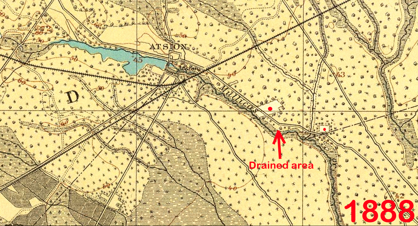 Don, you may me right. The farm shown in your map is just a tad to the North-west of the spot I pinpointed as the drained area. How big were the Fruitland farm lots? 20 acres? The drained area may still fall within the property boundary for that farm. The only thing is, according to several maps that feature the Fruitland lots, the lots didn't seem to extend beyond Quaker Bridge Road.