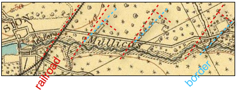 Great thread! There is a tiny third lot shown too. My hunch is that all three lots are within Fruitland but are older exceptions. Left to right, the first two property lines somewhat match the rectilinear railroad-era metes and bounds (red dashes), but are better aligned to Shamong/Washington Township border (blue dashes). The third parcel almost certainly predated the railroad. Are there records of Fruitland exceptions?